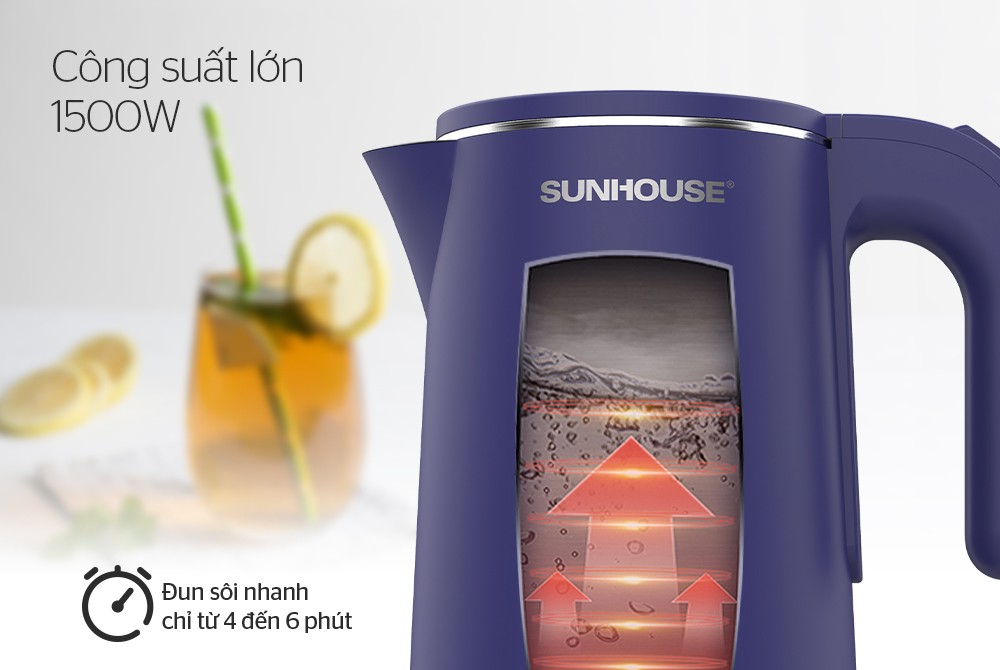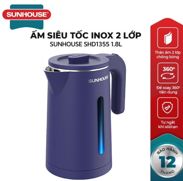 Nổi bật với thiết kế hiện đại, tinh tế, màu sắc trang nhã, ấm siêu tốc inox 2 lớp 1.8L SUNHOUSE SHD1355 là sự lựa chọn phù hợp cho những căn bếp hiện đại. Ấm có dung tích lớn 1.8 lít cùng công suất hoạt động cao (1500W) giúp việc đun nước nhanh chóng hơn, tiết kiệm thời gian và điện năng tối đa. Không chỉ là một thiết bị nhà bếp, ấm siêu tốc SUNHOUSE SHD1355 còn là một vật trang trí tinh tế cho căn bếp, thể hiện mắt thẩm mỹ của chủ nhà.