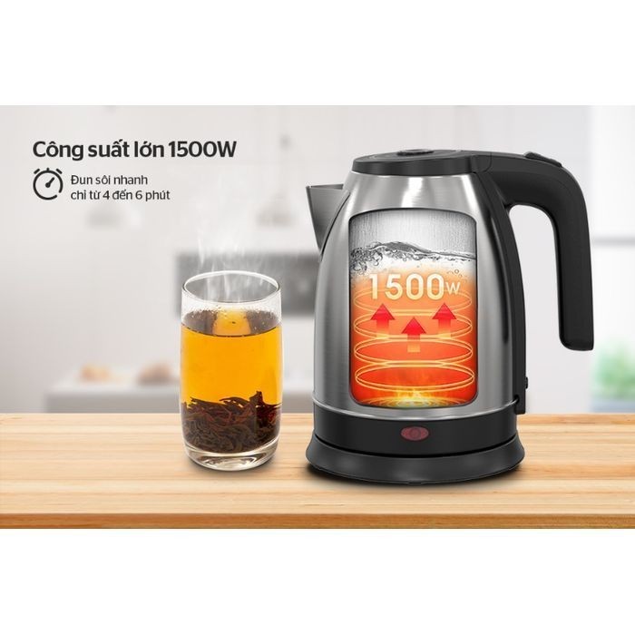 Công suất mạnh 1500W cho thời gian nấu nước nhanh chóng, chỉ trong 4 – 6 phút là bạn đã có nước sôi để pha chè, cafe, nấu mì… hay để nguội. Việc đun sôi nhanh cũng giúp tiết kiệm thời gian và điện năng tối đa.