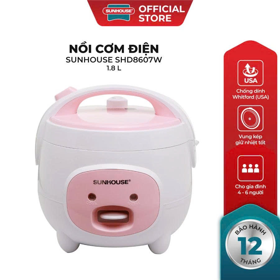 Nồi cơm điện SUNHOUSE SHD8607W có thiết kế trẻ trung, độc đáo, dung tích 1.8L phù hợp cho gia đình. Lòng nồi phủ chống dính Whitford (USA), vung nồi kép giữ nhiệt tốt, giúp cơm chín ngon, giữ trọn hương vị, mang lại trải nghiệm nấu ăn dễ dàng và thú vị hơn.
