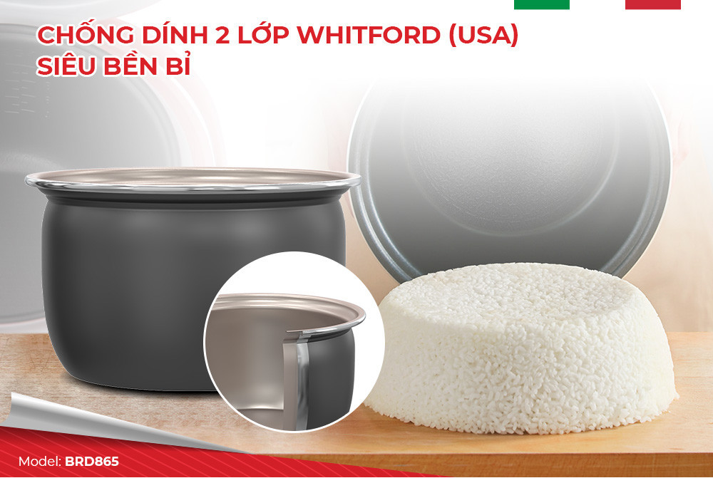 Công nghệ chống dính cao cấp Whitford Hoa Kỳ giúp hạn chế tối đa sự bán dính của cơm, giúp cơm ngon, dễ dàng vệ sinh sau khi nấu và đặc biệt an toàn với sức khỏe.