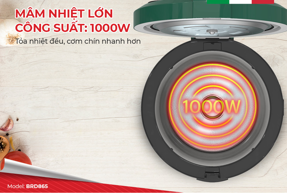Mâm nhiệt lớn, công suất 1000W, tỏa nhiệt đều, cơm chín nhanh