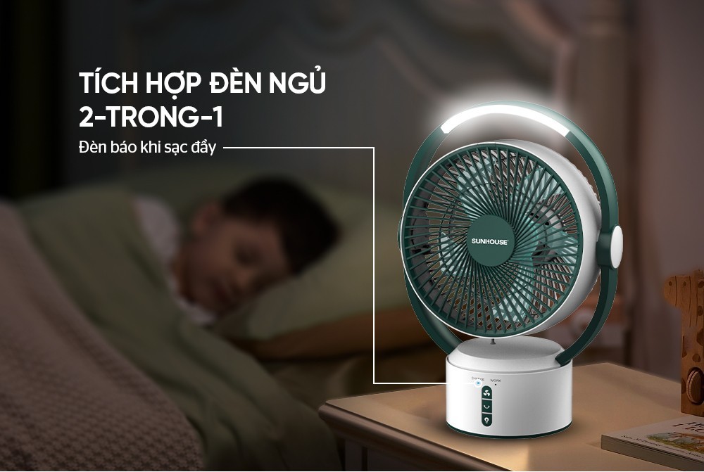 Được trang bị thêm đèn LED phía trên, Quạt sạc SUNHOUSE SHD7116 vừa làm mát hiệu quả, vừa hô biến thành một chiếc đèn ngủ xinh xắn. Không chỉ thế, riêng chế độ sáng quạt cũng có đến 2 chế độ để bạn tùy chỉnh theo nhu cầu, vô cùng tiện lợi.